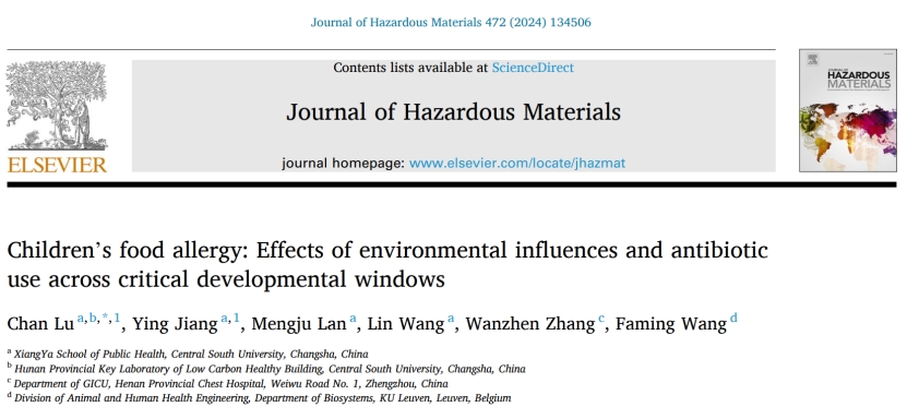 劳动卫生与环境卫生系路婵教授团队的研究成果 “Children's food allergy: Effects of environmental influences and antibiotic use across critical developmental windows” 在国际环境健康领域权威期刊Journal of Hazardous Materials(IF:13.6,JCR Top 5%,中科院1区TOP)以Research Paper发表。路婵教授为该文唯一通讯作者和共同第一作者,18porn