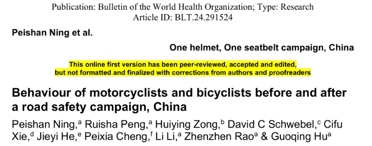 流行病与卫生统计学系胡国清教授团队的最新研究成果“Behaviour of motorcyclists and bicyclists before and after a road safety campaign, China”在国际公共卫生领域权威期刊、世界卫生组织官方期刊《Bulletin of the World Health Organization》(IF=8.4,SCI分区1区,Top 5%期刊)发表。18porn