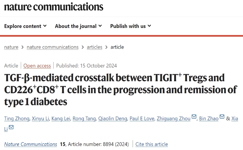 三诺营养与代谢健康研究中心赵斌教授团队与湘雅二医院李霞、周智广教授团队近日取得了一项重要发现,揭示了调控1型糖尿病(T1D)进展与缓解的全新机制。这一研究成果于2024年10月16日在国际知名期刊Nature Communications上发表,研究论文为“TGF-β-mediated crosstalk between TIGIT+ Tregs and CD226+CD8+ T cells in the progression and remission of type 1 diabetes”。该研究揭示了一个调控T1D疾病进展与缓解的全新机制:TIGIT+ Treg-TGF-β-CD226+CD8+ T细胞的相互作用与动态变化在T1D进展中起重要作用,靶向CD226可以抑制胰岛炎局部免疫细胞的失衡,进而遏制T1D的进展。