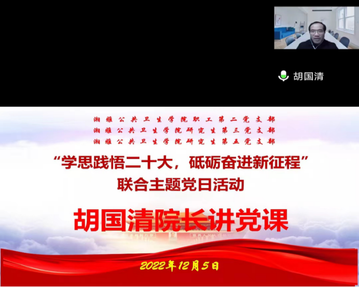 职工第二党支部、研究生第三党支部、研究生第五党支部“学思践悟二十大,砥砺奋进新征程”联合主题党日教育通过线上方式顺利开展。本次党日教育邀请到学院党委副书记、院长胡国清教授莅临指导并主讲党课,活动由学院党委委员、研究生第三党支部书记尹逊强同志主持。