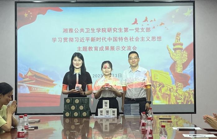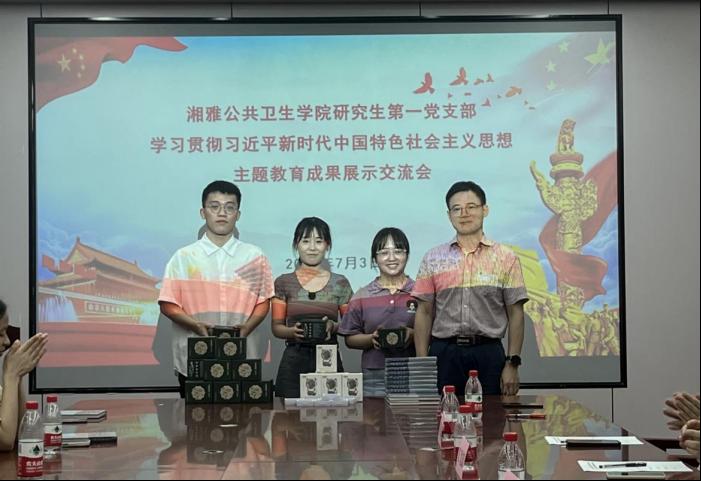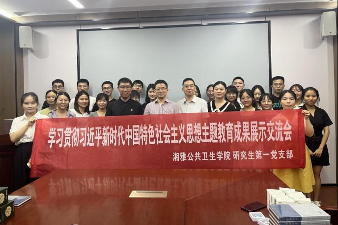 研究生一支部组织全体党员于公卫大楼A613会议室开展学习贯彻习近平新时代中国特色社会主义思想主题教育成果展示交流活动。学院党委书记雷先阳、副院长任国峰应邀莅临指导,学院办公室刘畅老师、研二支部副书记朱燕秋、研三支部宣传委员吴艳红、研四支部组织委员田淇百、研五支部副书记方鹏担任评委嘉宾,活动由支部书记肖铂洋主持。