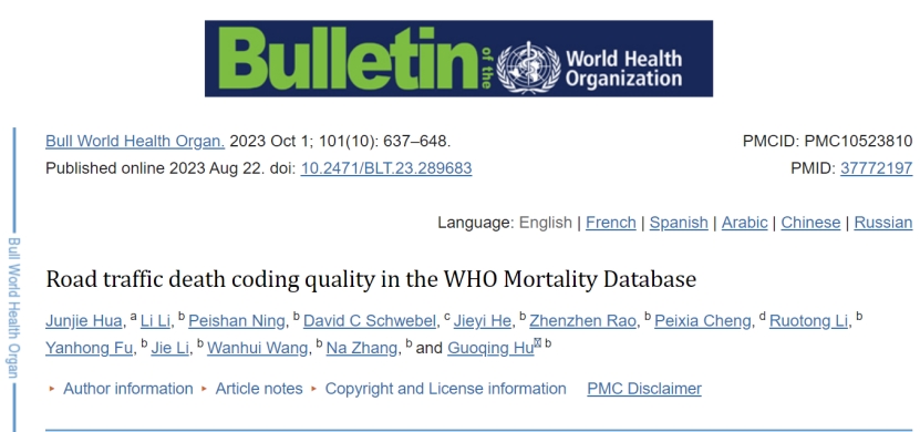 《Bulletin of the World Health Organization》是世界卫生组织旗舰期刊,关注全球重要公共卫生问题,该刊发表的所有研究型论文摘要均会被翻译成阿拉伯文、中文、法文、俄文和西班牙文五国语言,被联合国各机构和世界卫生组织各成员国政府广泛阅读,对全球各国卫生健康政策产生较大影响。该研究成果的发表,有助于推动利用世界卫生组织死亡数据库开展道路交通安全研究,对利用该数据库开展其他类型疾病的同类研究具有参考价值。