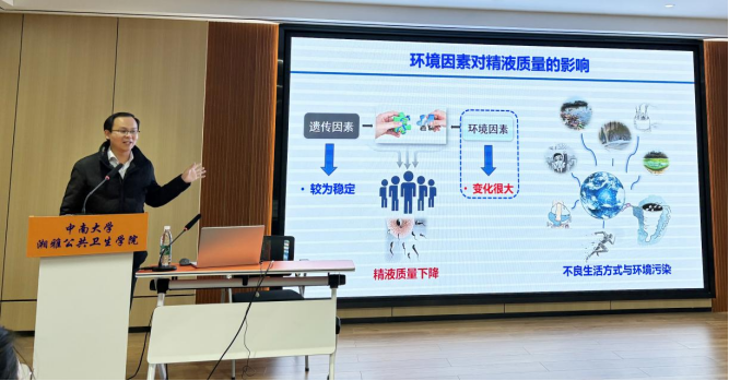 肖芳副院长首先代表学院对曾强教授的到来表示热烈欢迎。曾教授一直致力于环境污染与生殖健康研究工作,本次的报告题目为《饮用水消毒副产物致男性精液质量降低的中国人群证据》,针对人类目前面临的生殖问题,从全球男性精液质量状况、环境因素影响与男性精液质量关系等方面,为大家介绍了目前饮用水消毒副产物对男性精液质量降低的中国人群证据,丰富了同学们对环境污染物与男性生殖系统疾病因果关系的认识。