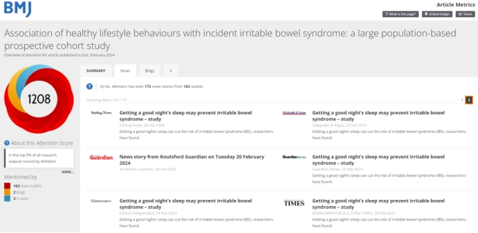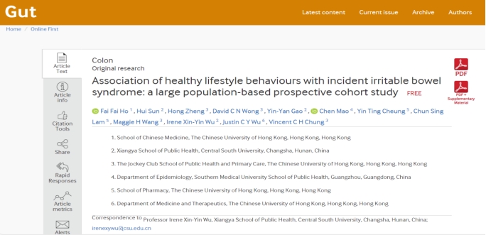 流行病与卫生统计学系吴心音教授团队的研究成果 “Association of healthy lifestyle behaviours with incident irritable bowel syndrome: a large population-based prospective cohort study”。已有包括美国有线电视新闻网(CNN)、英国独立报(The Independent)、卫报(The Guardian)在内的162家新闻媒体报道了该研究。该研究工作由18porn