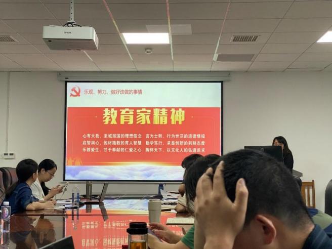 随后,在教育家精神的学习环节中,杨芳以袁亚湘院士“乐观、努力、做好该做的事情”为主题,带领大家从四个方面温习了袁老师一生求学、治学、育人的故事,学习他一生乐观、努力、积极服务社会,培养基础教育领域拔尖创新人才的教育家精神。
