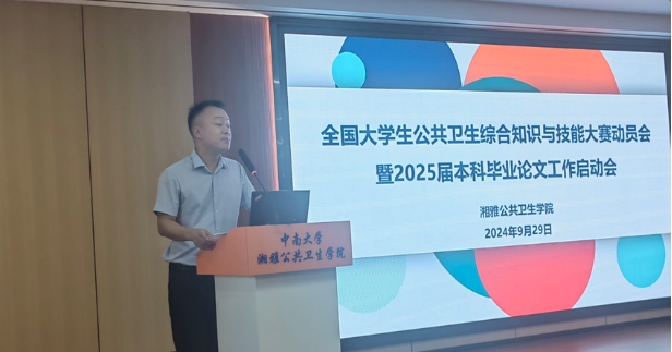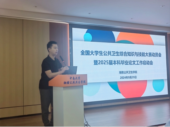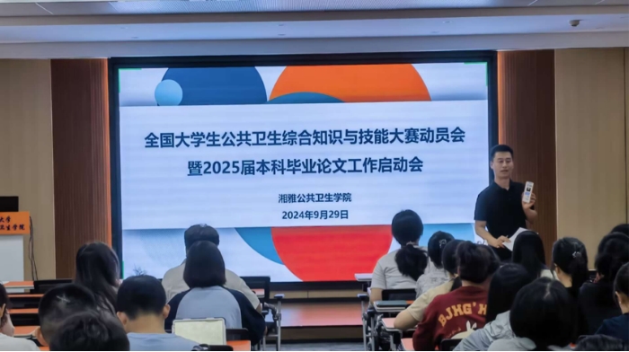 全国大学生公共卫生综合知识与技能大赛动员会暨2025届本科毕业论文撰写专题讲座在学院学术报告厅顺利召开。学院副院长秦家碧教授、公共卫生培训中心主任邓静副教授和预防医学专业2020级全体本科生共110余人参与会议。会议由业务办张伟老师主持。
