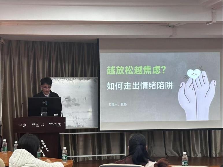 研究生第一党支部党员张杨围绕当代大学生的心理健康状态展开分享。通过身边的事例,分析了大学生心理问题产生的主要原因,帮助大家认识到情绪管理的重要性。张杨以自身经历为例,结合学习与生活中的实际情境,就如何走出情绪陷阱、缓解焦虑等问题提出了切实可行的建议,鼓励大家正视心理波动,并积极主动寻求支持与帮助。