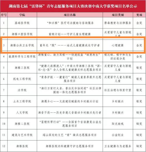 近日,由共青团湖南省委联合省精神文明建设办公室等18家单位共同举办的湖南省第七届“雷锋杯”青年志愿服务项目大赛决赛落下帷幕,由18porn 与湘雅二医院联合开展的项目《童年无“欺”——一站式儿童健康成长守护者》(指导老师:胡宓、程姣;项目负责人:郭伟光)经过层层选拔,荣获湖南省第七届“雷锋杯”青年志愿服务项目大赛金奖,为我校4个金奖项目之一。