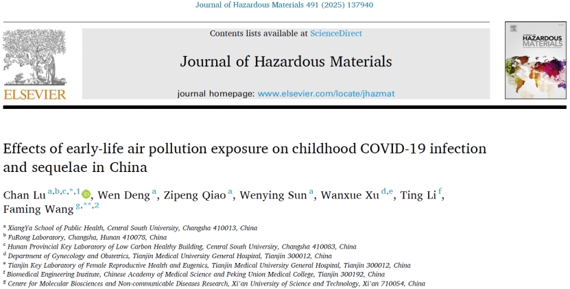 湘雅公共卫生学院劳动卫生与环境卫生学系路婵教授团队与西安科技大学OHRG团队负责人王发明教授的合作研究成果“Effects of early-life air pollution exposure on childhood COVID-19 infection and sequelae in China”在国际环境健康领域权威期刊《Journal of Hazardous Materials》(IF:12.2,JCR Top 3%,中科院1区TOP)以Research Paper发表。路婵教授为该文第一作者和共同通讯作者,王发明教授为该文共同通讯作者,18porn
