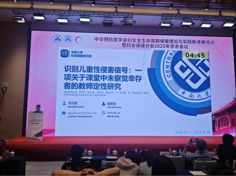 在妇女保健新进展培训专题中,马艺函以《识别儿童性侵害信号:一项关于课堂中未察觉幸存者的教师定性研究》为题作专题报告。报告指出,学校环境下监测儿童性侵害的主要挑战在于现有信号缺乏足够特异性,增加了识别的难度与误判风险。在此背景下,亟需建立校园性侵害预防监测体系,规范教师使用的识别工具与报告流程,从而提升早期发现的敏感性和准确性。该研究为推动学校场景中儿童性侵害防控体系的科学构建提供了重要的实证基础,也为教育系统中前线工作人员的培训与支持指明了方向。