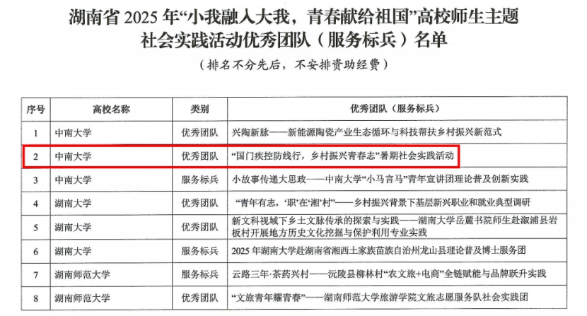 近日,中共湖南省委教育工委、湖南省教育厅发布了《关于公布湖南省高校2025年“小我融入大我,青春献给祖国”高校师生主题社会实践活动优秀团队(服务标兵)名单的通知》。经各高校推荐、资格审核、专家评选,18porn