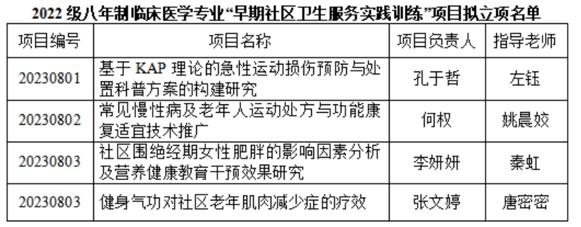 业务办公室组织实施了2022级八年制临床医学专业“早期社区卫生服务实践训练”项目立项评审工作。经个人申请、形式审查、学院评审,拟确定2022级八年制临床医学专业“早期社区卫生服务实践训练”项目立项4项,现将名单进公示。公示期:2023年8月23日至8月25日。