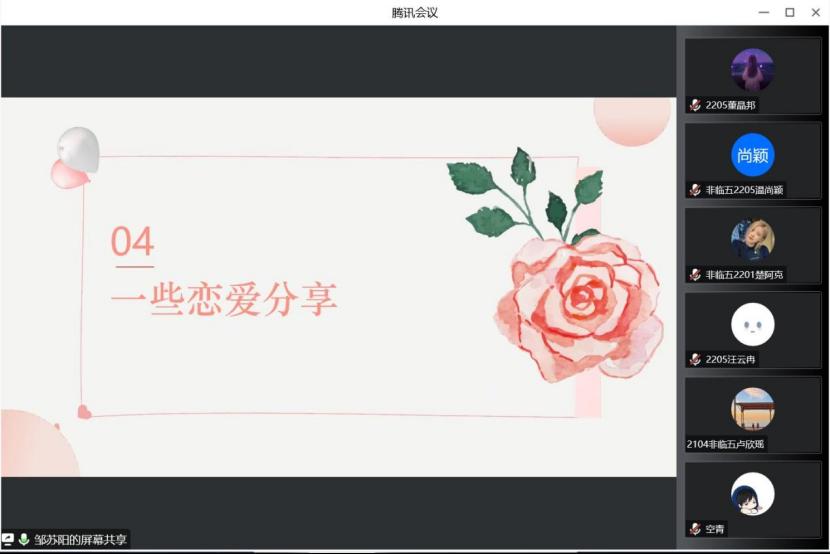 最后,邹苏阳同学通过分享一些关于恋爱的小知识,帮助同学们树立正确的恋爱观,提醒同学们在恋爱中保护自己。讲解过程中,她播放了电影《煤油灯》中的一个片段,并借此向同学们阐述什么才算是一段健康的恋爱。除此之外,她还说到了恋爱的四个阶段:相遇、相识、相知、相恋。最后,她向同学们强调要树立正确的价值观念,做好自我保护,努力提升个人价值,为两个人的“相遇”埋下伏笔。