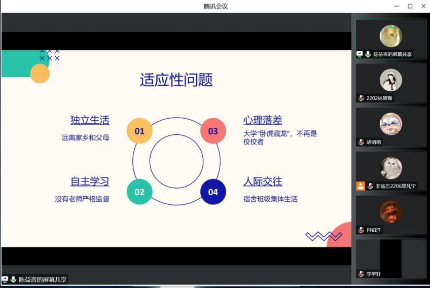 辅导员肖铂洋及2022级全体新生共同参与了此次活动,本场讲座由非临五2206班邵凡宁同学主持,胡萌萌、陈益言、王思宇、邹苏阳四位2021级同学担任主讲嘉宾。本场讲座的主要目的是解决2022级新生在学习、生活、心理等方面遇到的问题,使同学们以一种积极向上的心态备战期末考试,改进学习方法,处理情绪问题,开拓人际交往,从而更好地适应大学生活。