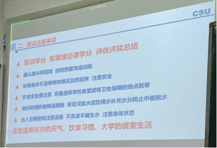 在军训注意事项部分,副书记提醒同学们端正思想态度,听从教官指挥,注意饮食卫生,留意身体状态,如有特殊情况及时报备。