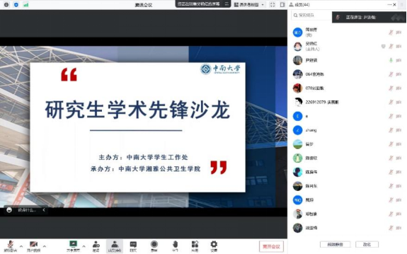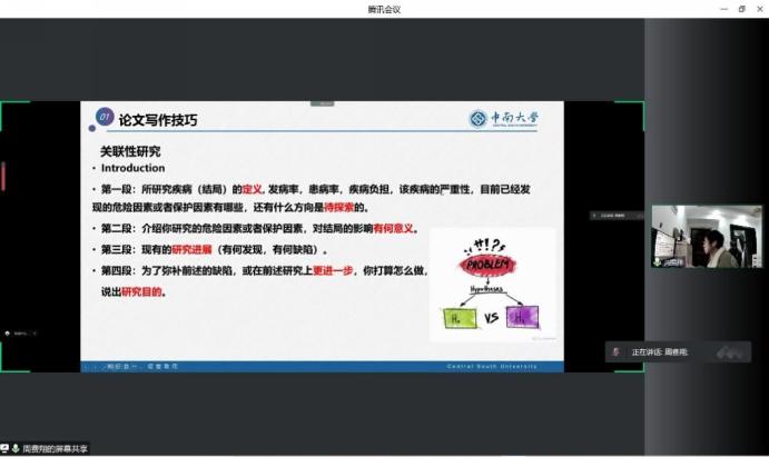 通过腾讯会议APP,以线上会议的形式举办了“科研论文写作规范及策略分享”学术先锋沙龙系列活动。本次活动由学工办副主任尹逊强老师主持,邀请了2021级流行病与卫生统计学系博士研究生张娜、2022级流行病与卫生统计学系博士研究生周费翔结合个人的科研学习经历,为大家分享了健康医疗大数据建模方法与运用、英文论文写作与选刊技巧等内容。共有60余名研究生同学参与。